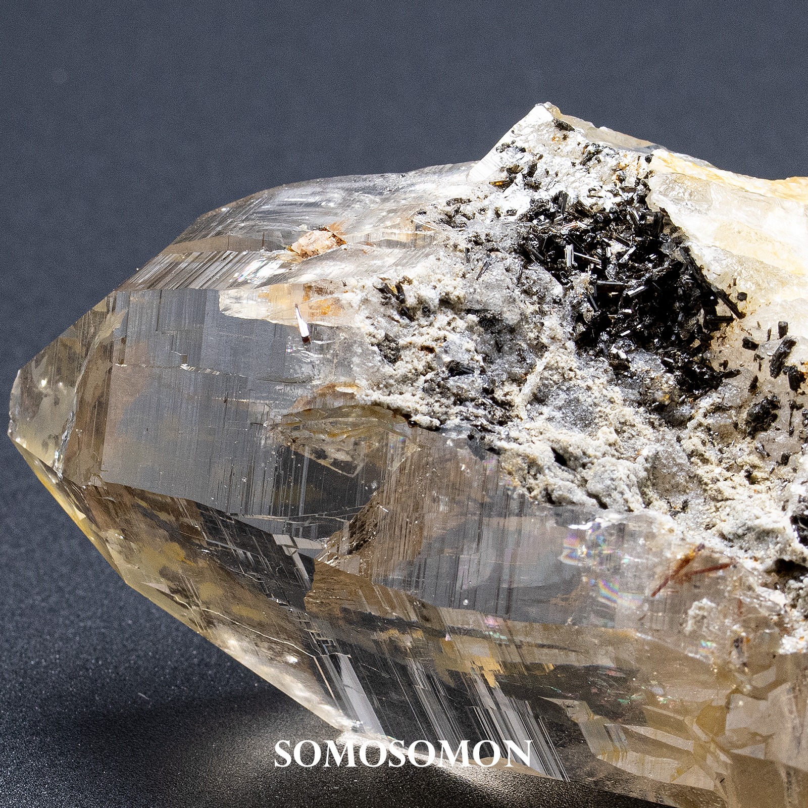 一部には、ピンクゴールド色のトルマリンが針のように内包されているところもあり、